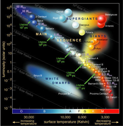 La couleur des étoiles est une indication de leur température de surface ! Tu sais probablement que les étoiles sont d’immenses boules de gaz - le Soleil, qui est une étoile, est près de 100 fois plus grand que la Terre ! La couleur de cette boule de gaz dépend de sa température. C’est comme une barre de fer : Si on la chauffe un peu elle devient rouge sombre. Si on la chauffe plus elle devient rouge vif. A plus haute température elle devient orange, puis jaune, puis presque blanche. Bien sûr la barre a déjà fondu et c’est alors du métal liquide. Si on chauffe ce métal liquide encore plus, il devient bleu ! eh oui, BLEU ! Le bleu, couleur de la glace, est aussi la couleur des très hautes températures !