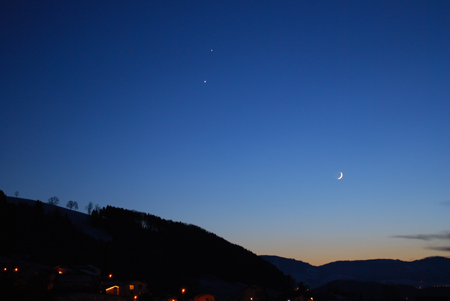 Sur cette photo, que j’ai réalisé en 2008, on peut voir Vénus (en-dessous), Jupiter (en-dessus) et un croissant de Lune