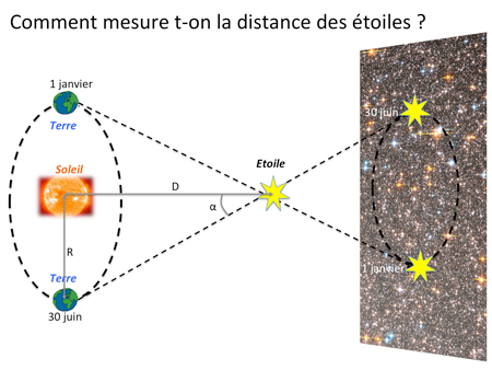 Si l’on observe une étoile pas très lointaine le 1 janvier, on va la voir avec des étoiles lointaines en arrière-plan qui ne sont pas les mêmes que le 30 juin. C’est le déplacement de l’étoile par rapport au fond qui est utilisé.