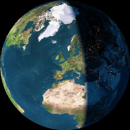 On sait que la Terre est une sphère et qu’elle tourne sur elle-même. À un instant donné, une moitié de la sphère est tournée vers le Soleil et reçoit donc sa lumière, tandis que l’autre moitié est tournée de l’autre côté et donc est dans l’obscurité. Au cours du temps, la face exposée au Soleil passe peu à peu du côté obscur et la face dans l’obscurité entre dans la lumière. C’est donc le mouvement de rotation de la Terre qui est la cause de l’alternance de jour et de nuit.
